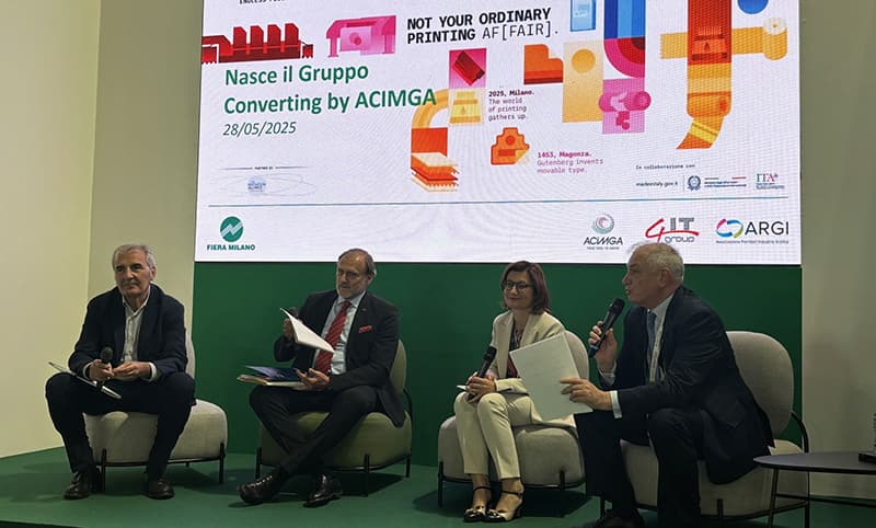 Acimga Director Enrico Barboglio along with association advisors Aldo Peretti, CEO, Uteco Group; Stefano Bartolini, Group CEO, IMS Technologies; and Elena Bottoli officially presented Acimga’s newly formed Converting Group.